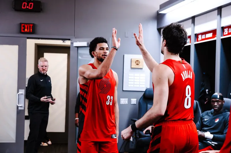 虎撲12月15日訊 開拓者官方曬球隊賽后更衣室慶祝照片,并配文:一起打球有著特別的衣室義特意義。