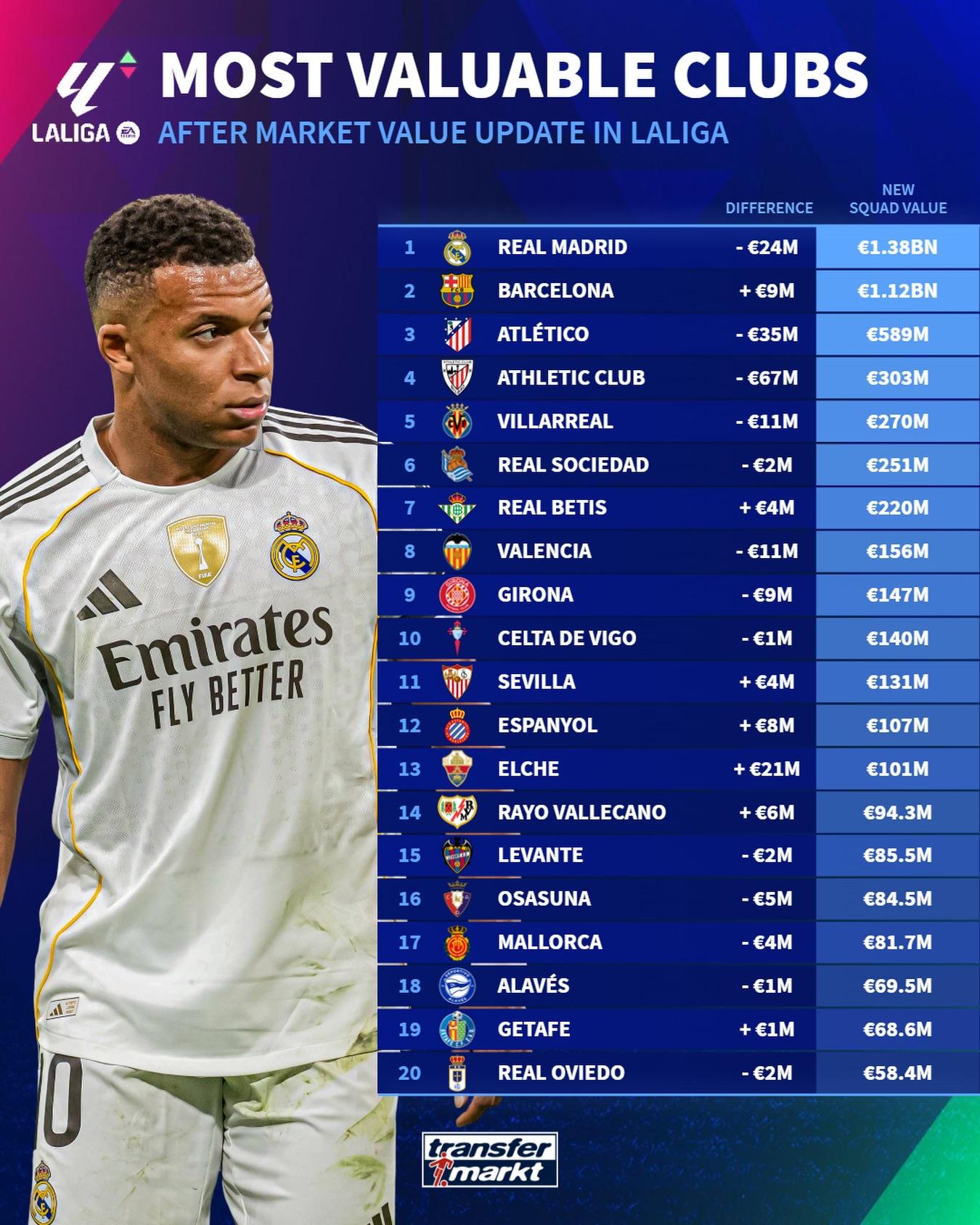虎撲12月13日訊 西甲聯(lián)賽球員身價(jià)更新后,德轉(zhuǎn)盤點(diǎn)了西甲最具價(jià)值俱樂(lè)部排名,名皇具體名單如下: