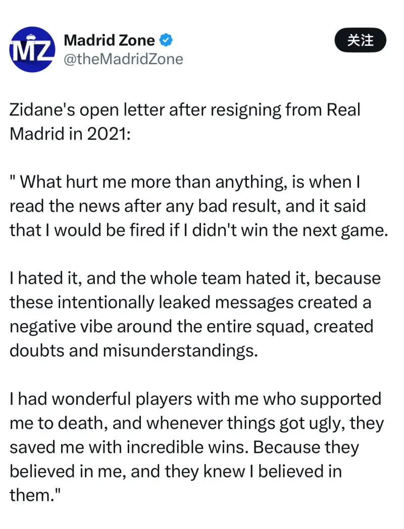 轉(zhuǎn):齊達(dá)內(nèi)在2021年從皇家馬德里辭職后發(fā)表的公開(kāi)信
