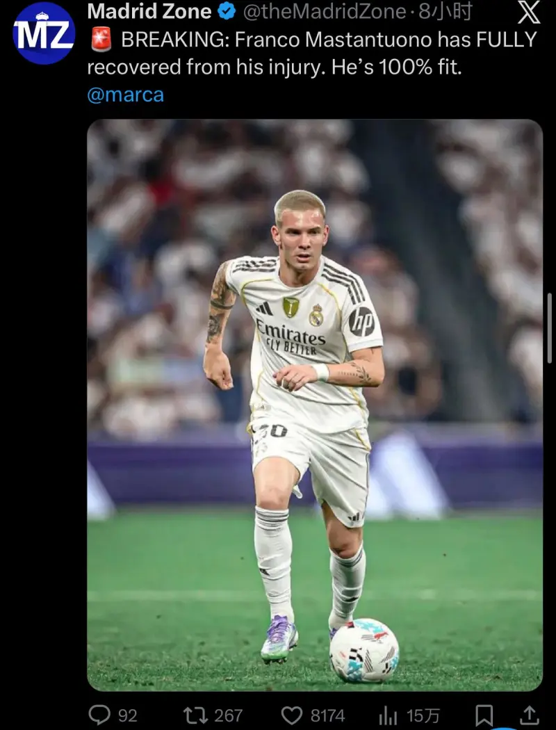 馬卡:皇馬球員馬斯坦托諾已完全傷愈,馬卡馬狀態(tài)100%。皇馬