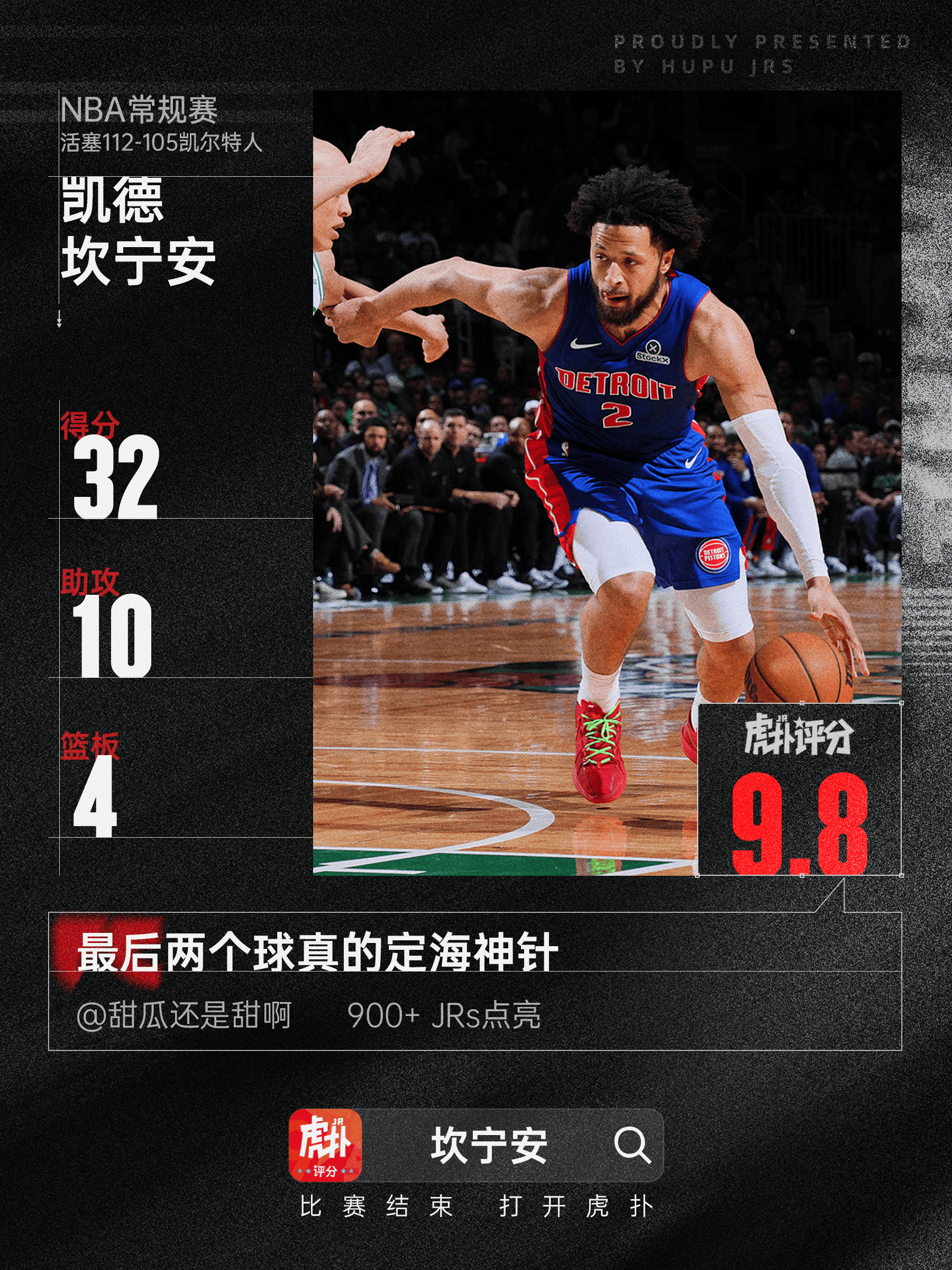 本場比賽,分中分籃活塞球員凱德-坎寧安出戰(zhàn)36分鐘,砍下21投11中,其中三分球10投6中,罰球4投4中,得到32分4籃板10助攻1搶斷。
