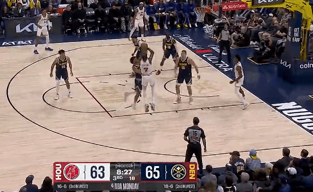 NBA常規(guī)賽,火箭客場對陣掘金的球急比賽正在進(jìn)行中。