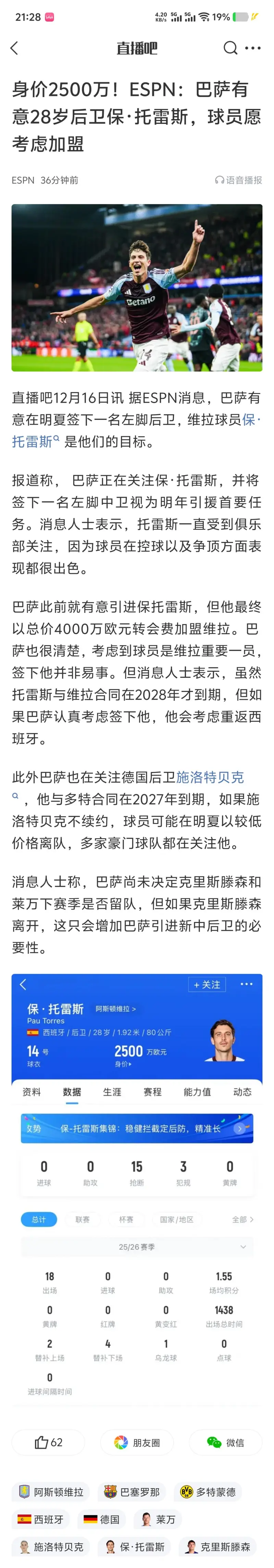身價2500萬!身價薩ESPN:巴薩有意28歲后衛(wèi)?!ね欣姿?,巴保托