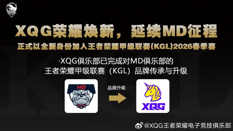 為適配品牌戰(zhàn)略升級(jí)規(guī)劃,原MD電子競(jìng)技俱樂(lè)部 于2025年11月正式完成品牌戰(zhàn)略升級(jí),告適以全新身份 XQG電子競(jìng)技俱樂(lè)部榮耀加入王者榮耀甲級(jí)聯(lián)賽(KGL)2026年春季賽的配品牌戰(zhàn)大家庭。