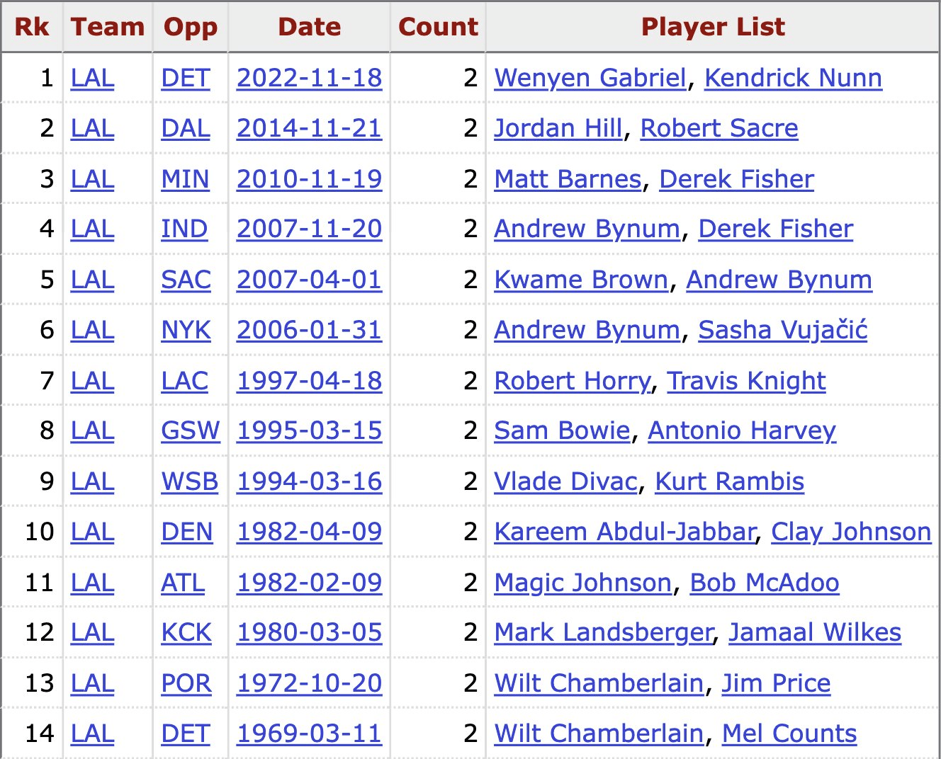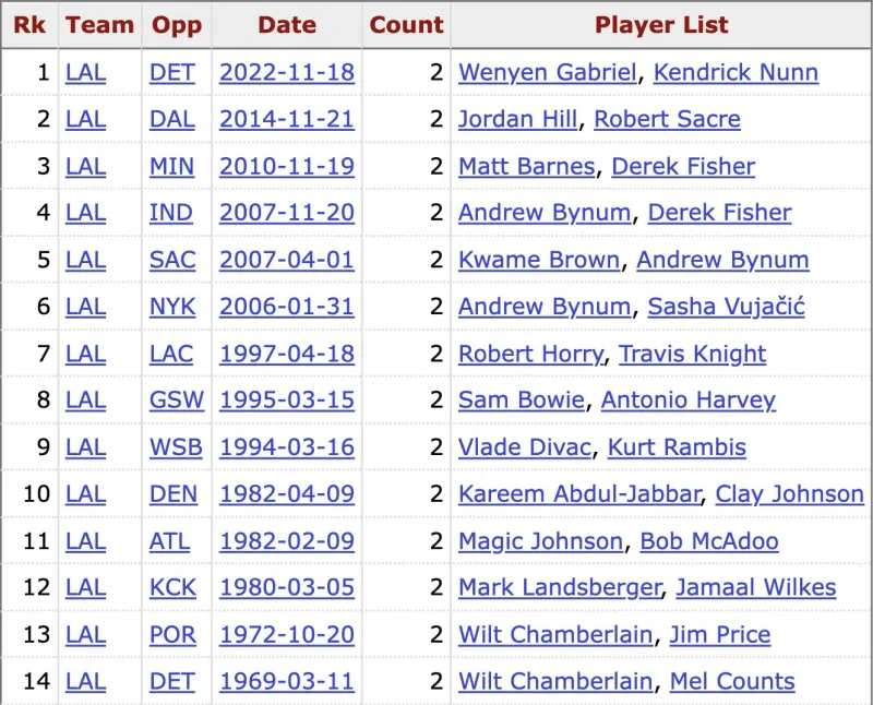 本場艾頓和海斯同時得分上雙且命中率90%以上,湖人隊史第15次出現(xiàn)兩人同場得分上雙且命中率90%以上。