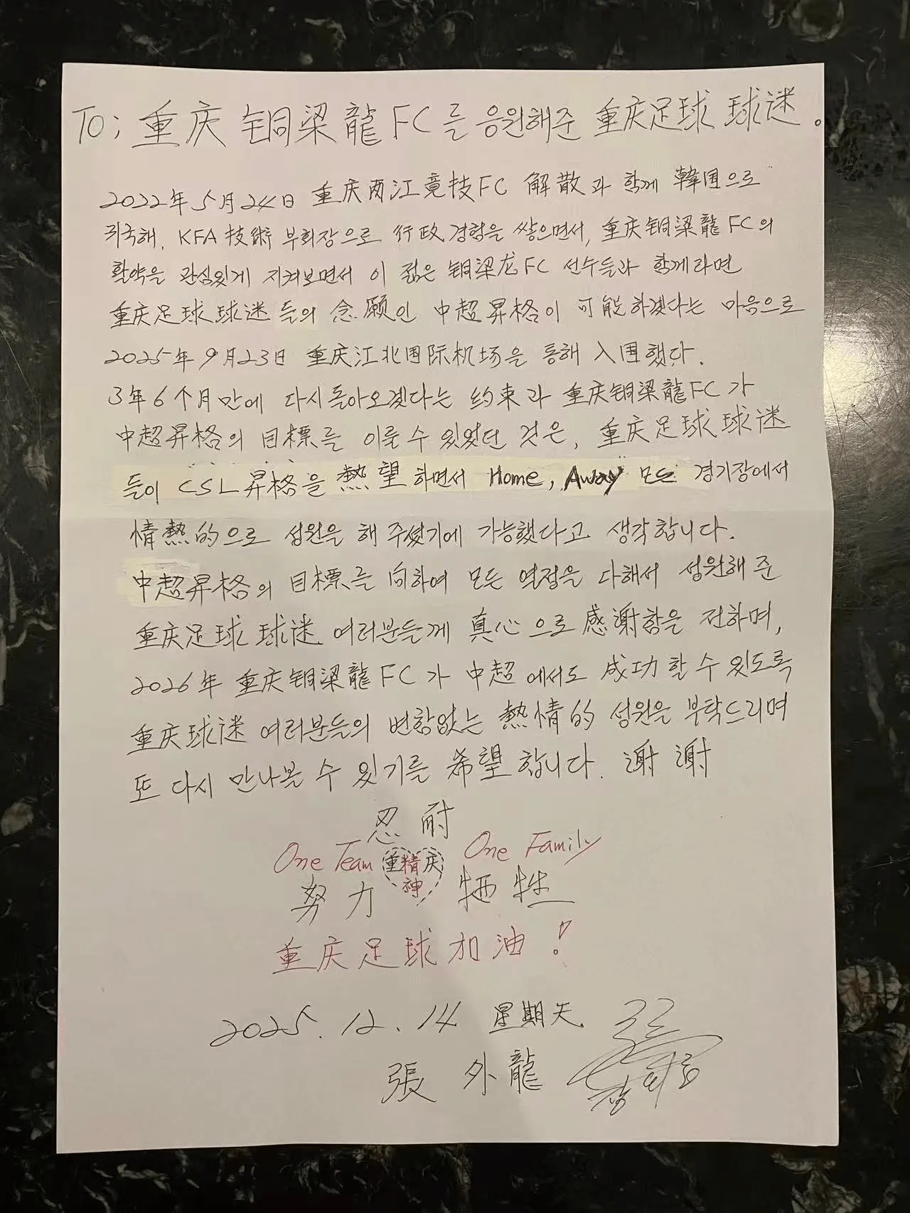 [流言板]張外龍手寫(xiě)信感謝重慶球迷:懇請(qǐng)大家繼續(xù)支持重慶銅梁龍