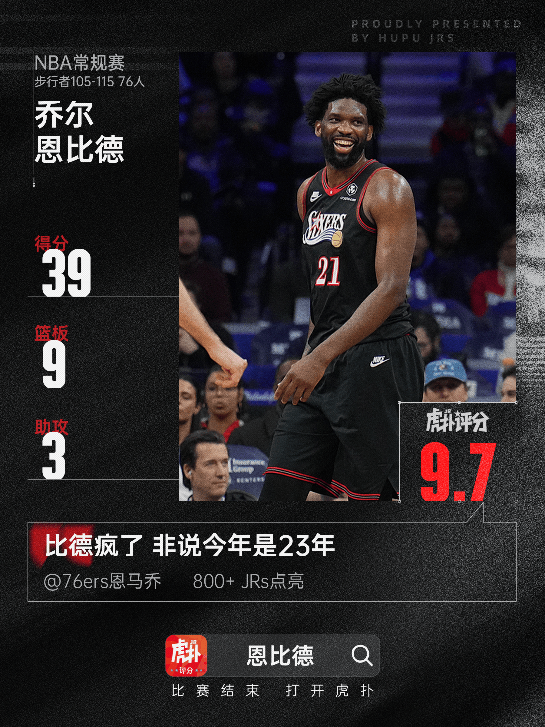 大帝出征!大帝德全恩比德全場砍下39分9籃板3助攻1搶斷由虎撲籃球資訊 發(fā)表在籃球資訊 https://bbs.hupu.com/502