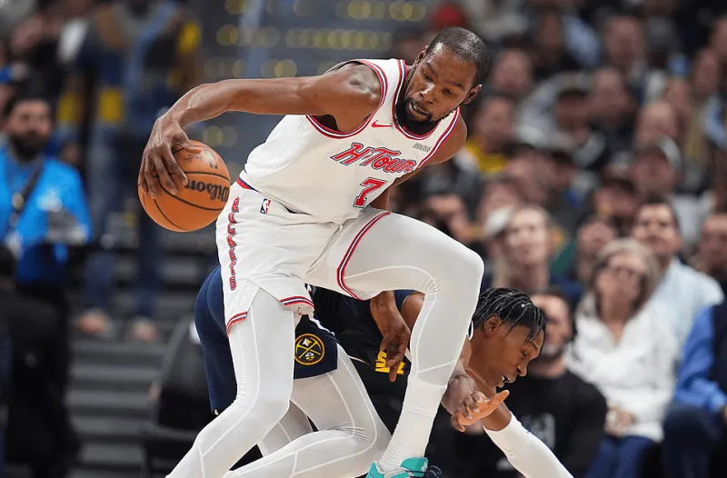 本場(chǎng)比賽,凱文-杜蘭特首發(fā)出戰(zhàn)44分鐘,14投8中,三分球3投2中,罰球8罰7中得到25分5籃板7助攻1搶斷5封蓋。掘金球員尼古拉-約基奇出戰(zhàn)42分鐘,27投13中,其中三分球9投5中,罰球11投8中,得到39分15籃板10助攻2搶斷2封蓋。