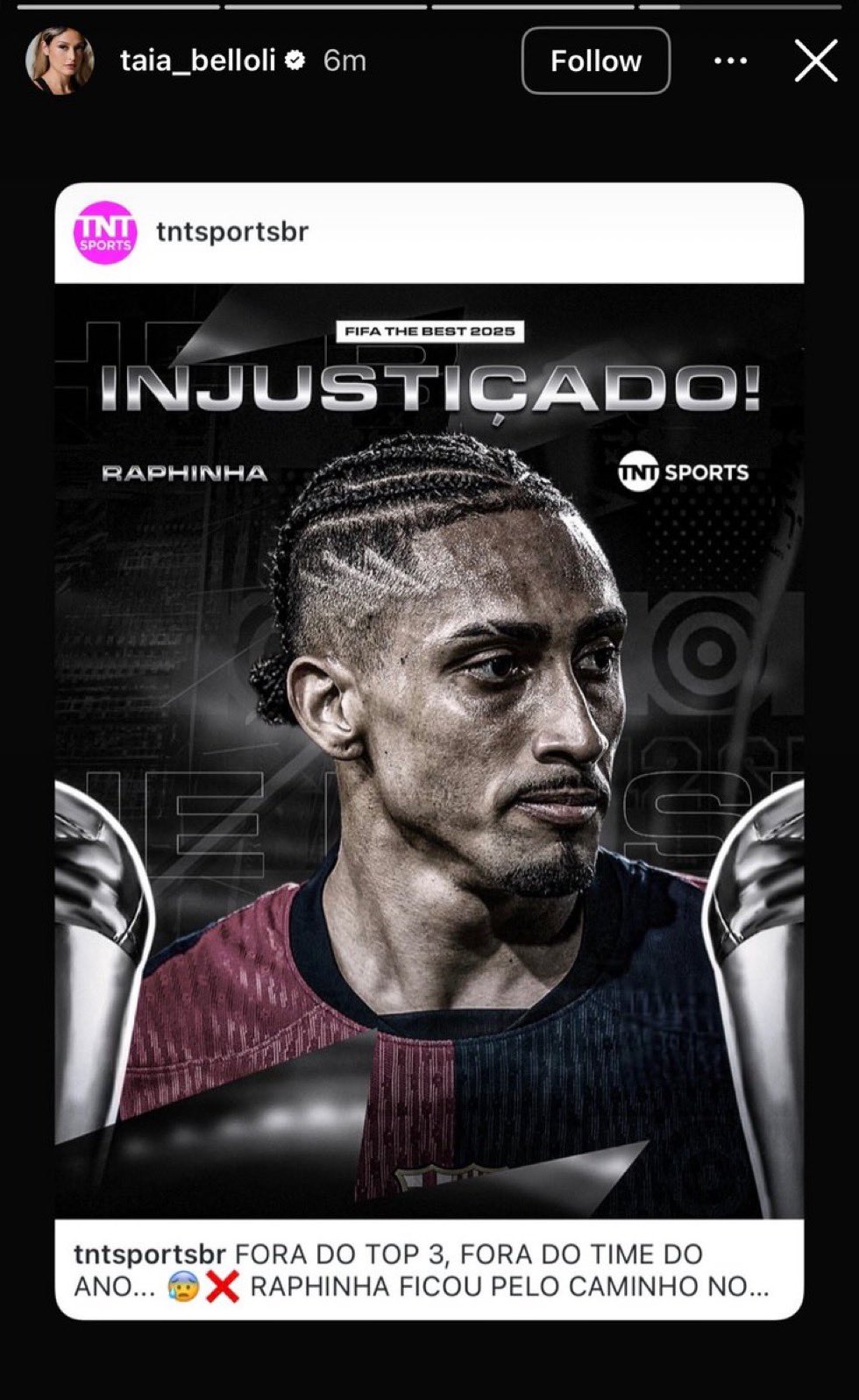 最新一條動態(tài)中,她轉(zhuǎn)發(fā)了巴西媒體TNT Sports制作的拉菲尼亞海報,圖中直接寫道“被不公正對待”,并指出拉菲尼亞無緣年度最佳陣容以及相關(guān)評選。
